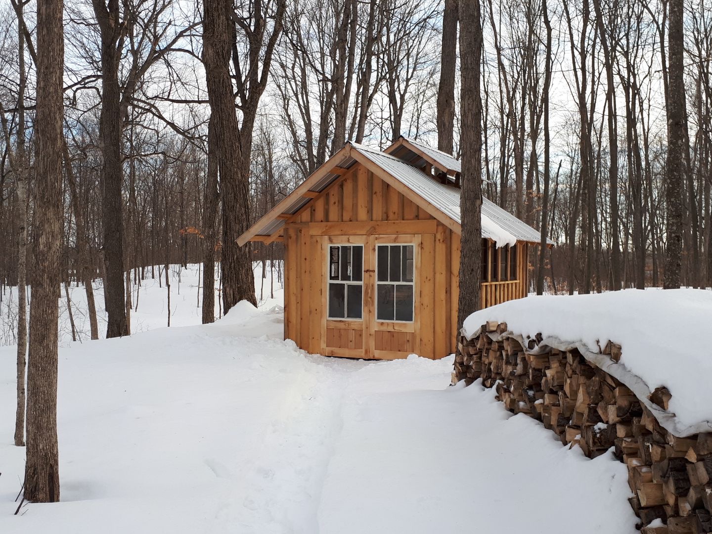 Thanks to our partners, Rick and Suzanne, we have a snazzy sugar shack with refurbished windows and doors to look out at the beautiful trees; a stove that burns our wood efficiently and an evaporator that does its magic. Turning fresh sap into delicious syrup.