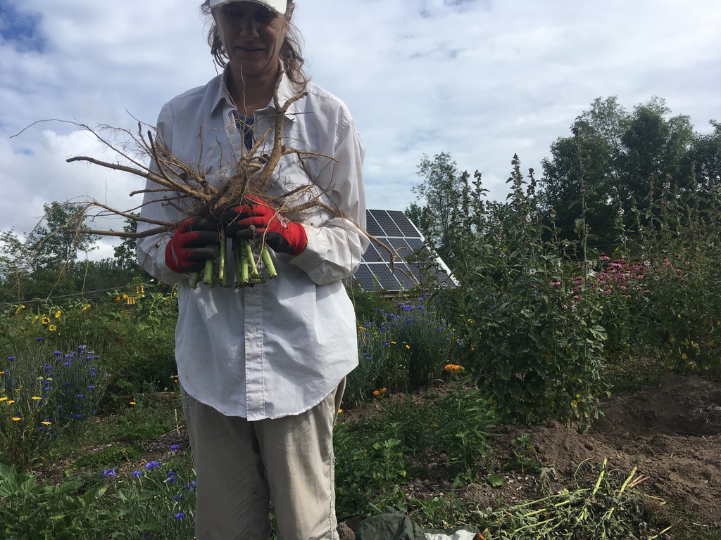 I have honed in on the two varieties I like best, Susan Delafield and Sicilian, whilst keeping a small number of Russian Red and Music for those of you who must have your fix of these. Susie D and Sicilian are different: one is hardneck and one is a softneck. One scapes and one doesn’t. They are both super flavourful. Susan has about 4 large cloves and is easy to peel. Sicilian has around 8 medium to small cloves, that are terrific crushed. Sicilian lasts. In fact, there are still a few little Sicilians in my pantry from last year’s harvest. I grow smaller amounts now and am enjoying that; caring for the bulbs is less onerous this way.