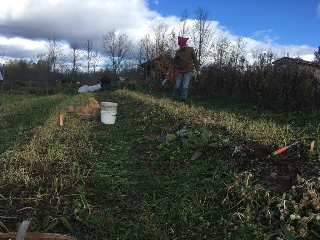 Planting garlic in November with Karen in to scythed down beds of oats and peas. An experiment.